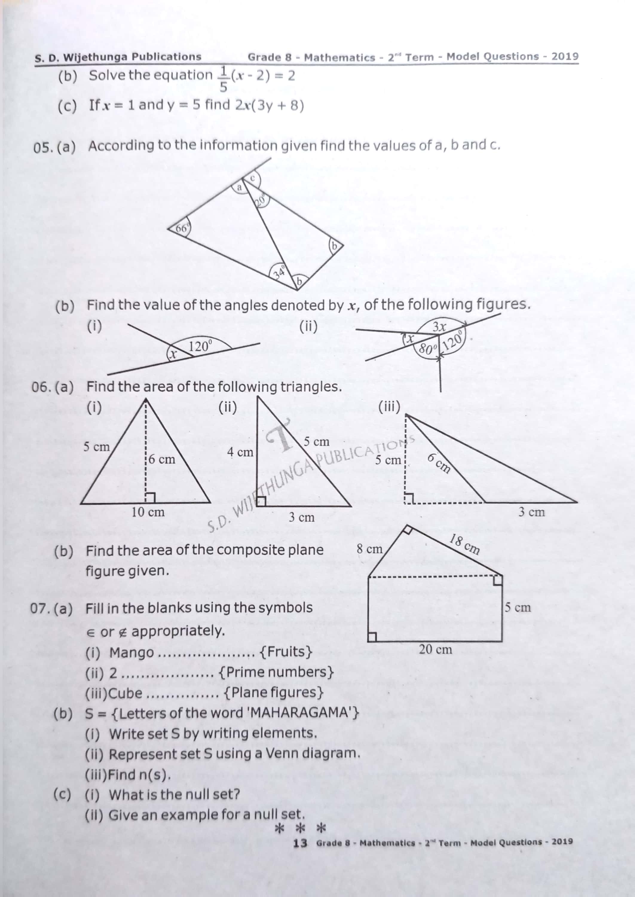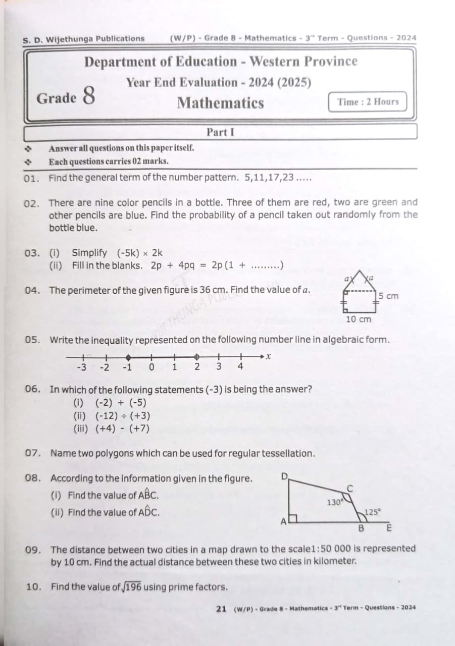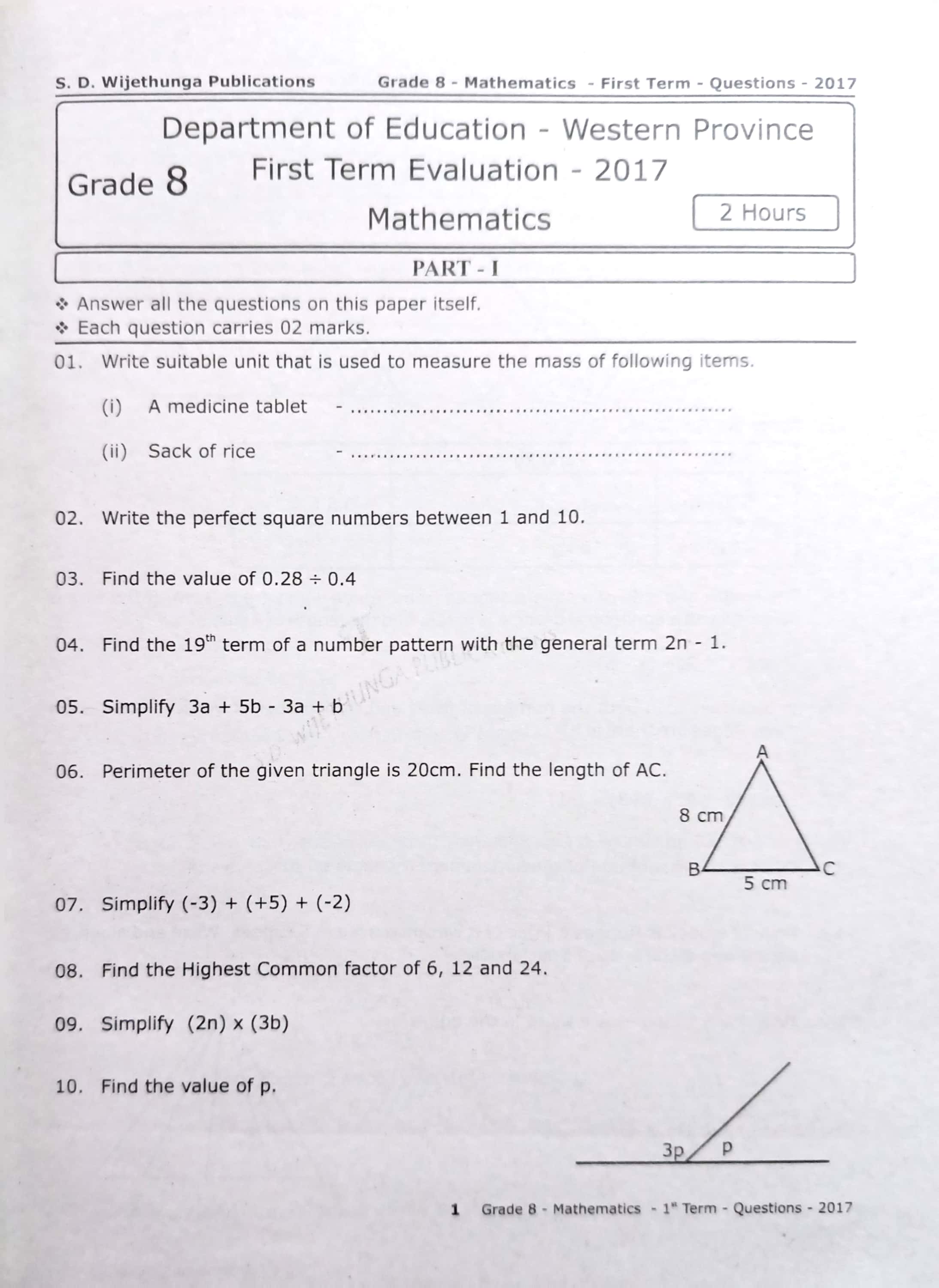 Grade 8 Mathematics Western Province Past Paper With Answer